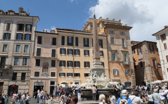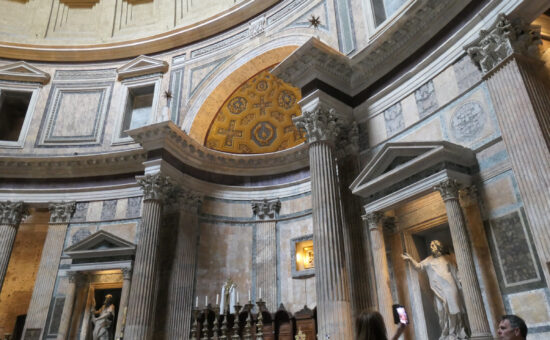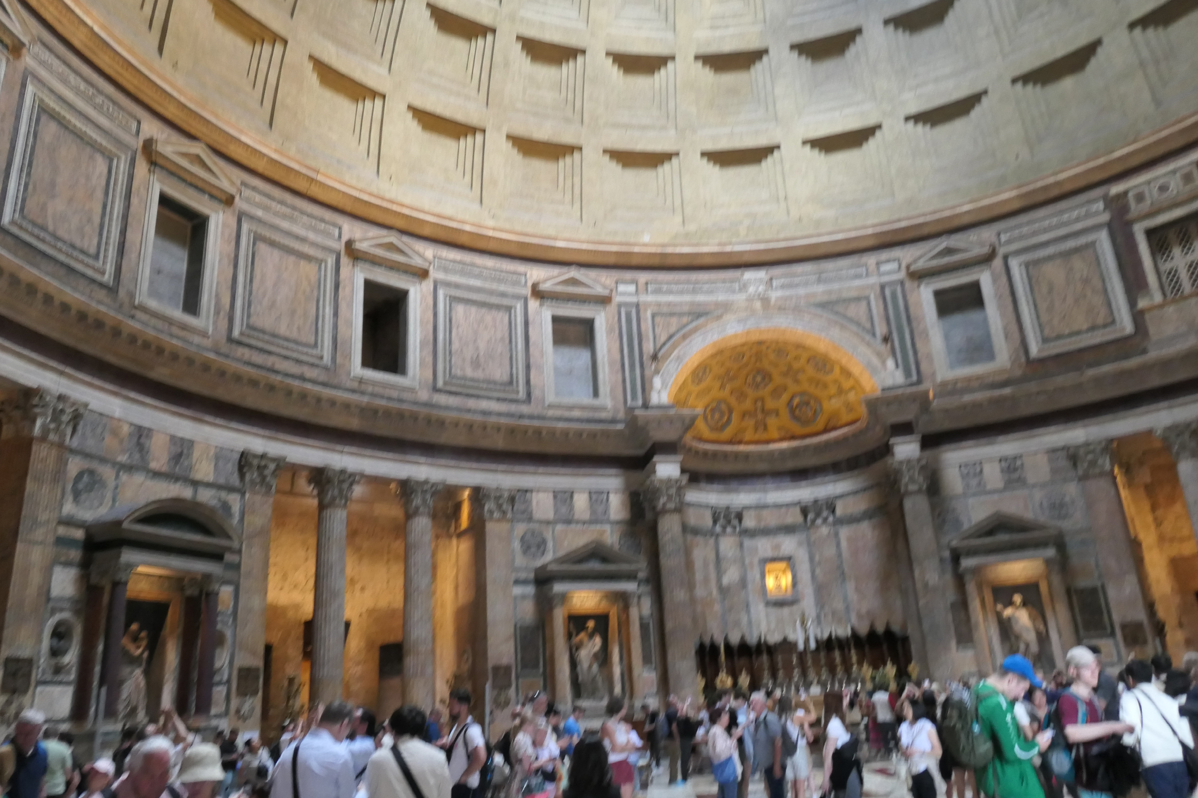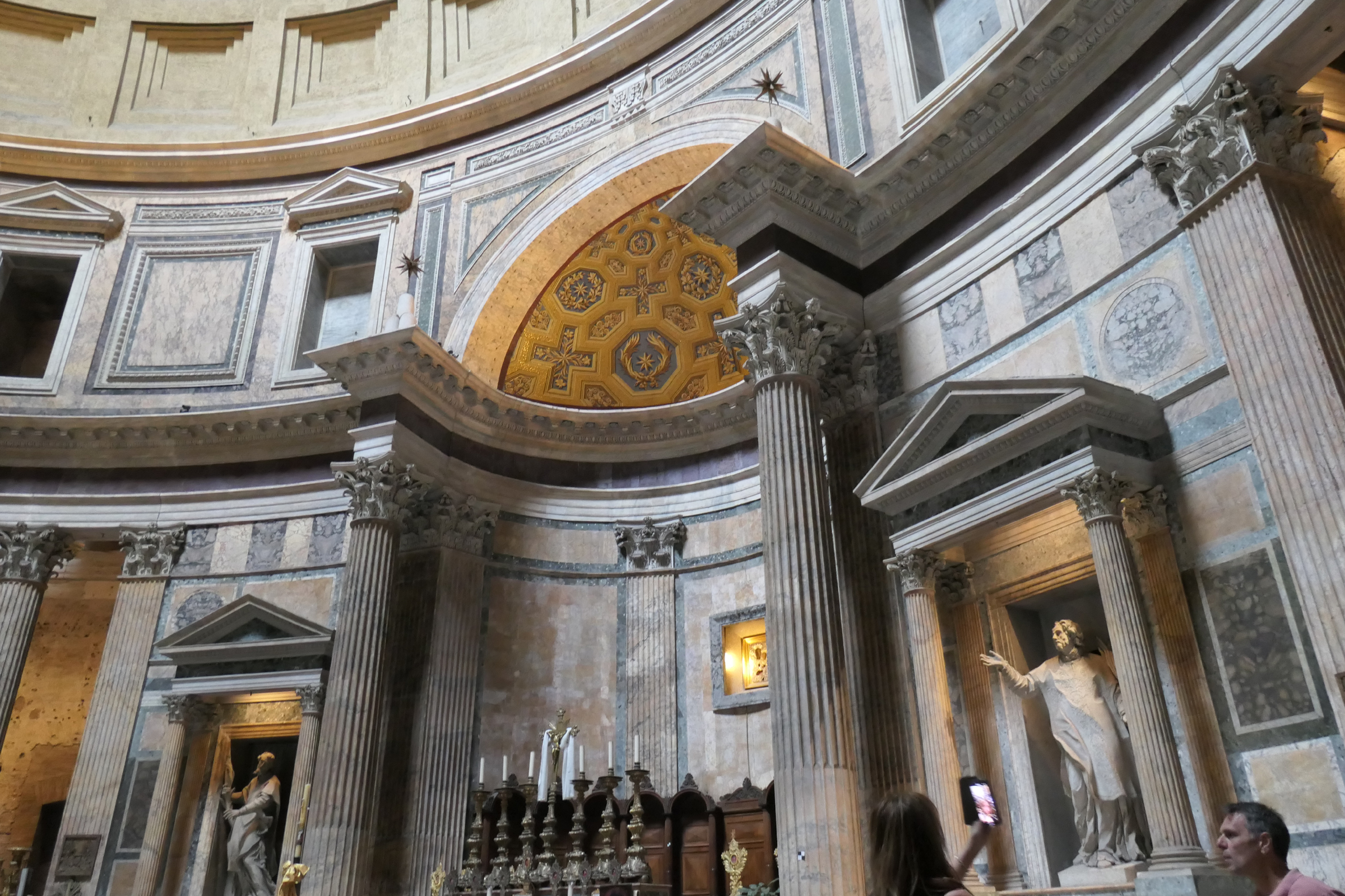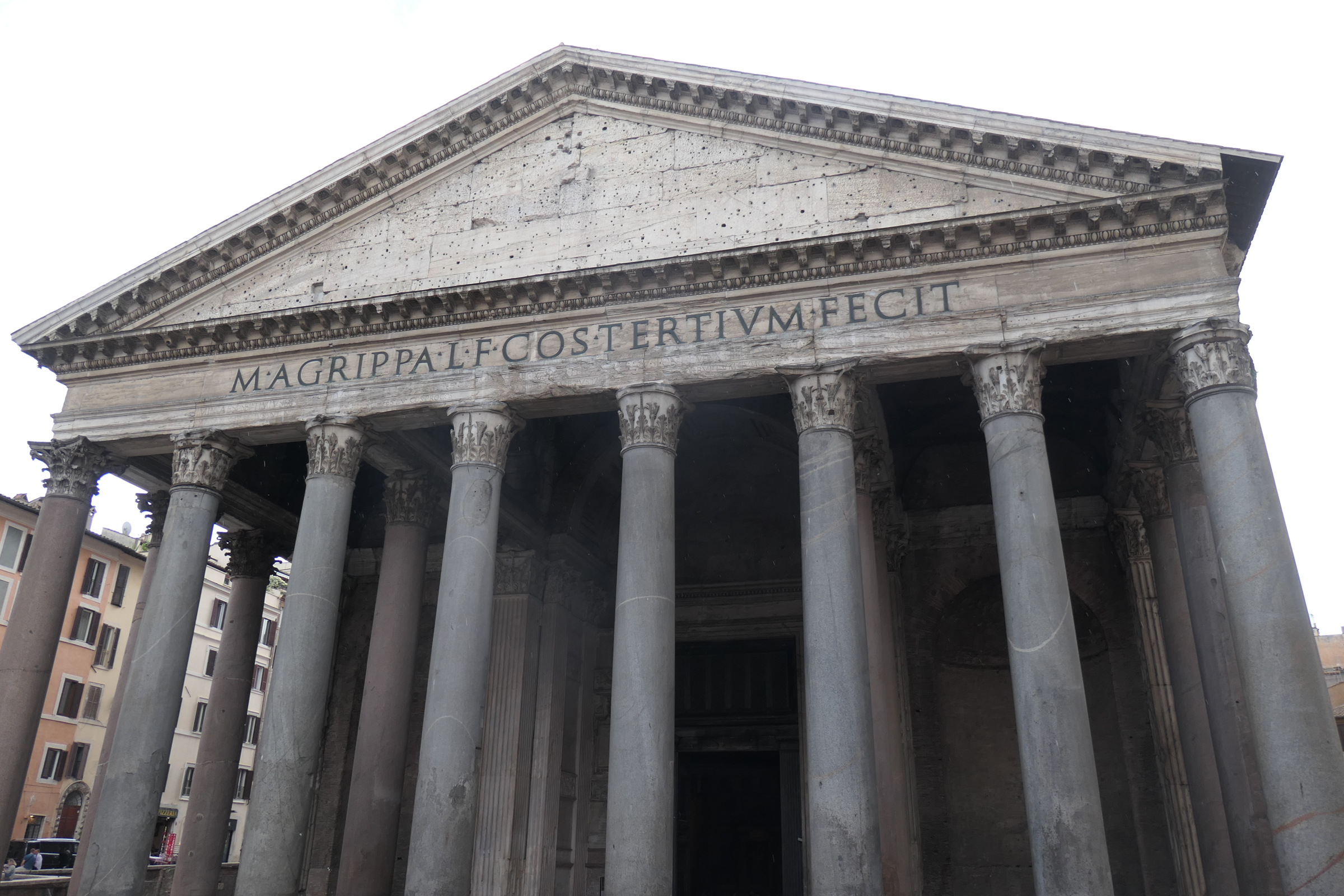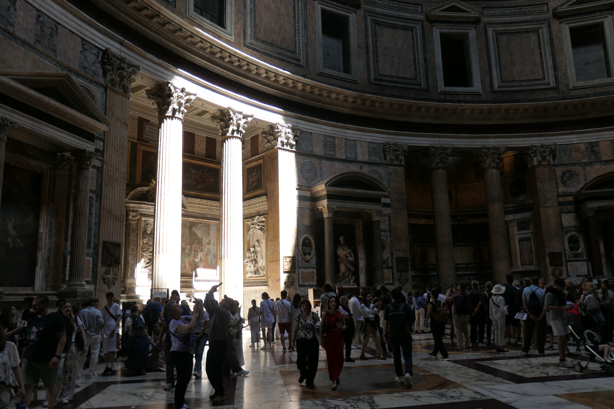 Gut erhalten zeigt sich das antike Pantheon, ab 126 n.Chr. unter Kaiser Hadrian vollendet, mit seiner beeindruckenden und oben offenen Kuppel, mit mehr als 44 Metern die größte und älteste Betonkuppel der Welt. Durch ihre Öffnung kann Regen ins Innere dringen.